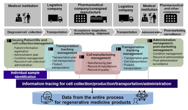 In many countries, research and development is on-going on regenerative medical products that are expected to open up paths to new therapies for diseases for which there have been no effective treatment methods. A characteristic of regenerative medical products is that cells used in administration are collected from the patient him/herself or cell donor, incubated and injected to the patient. Thus, it is necessary to manage individual cells and data for tracing them in every process throughout the supply chain. In this context, a brand-new supply chain system is desired for the reliable and safe distribution of regenerative medical products. Therefore, it is becoming more important that the infrastructure can collect, store and use data from diverse stakeholders by utilizing the state-of-the-arts digital technologies including IoT and AI.