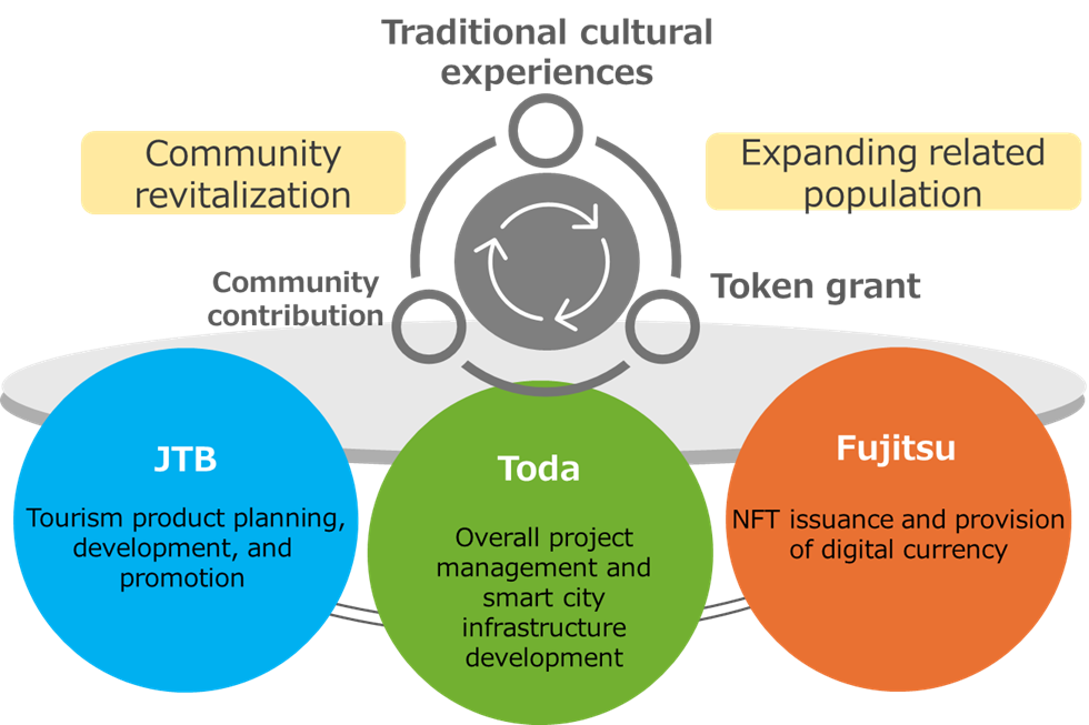 - Toda Corporation: Overall project management and smart city infrastructure development - JTB Corp.: Tourism product planning, development, and promotion - Fujitsu Limited: NFT issuance and provision of digital currency technology