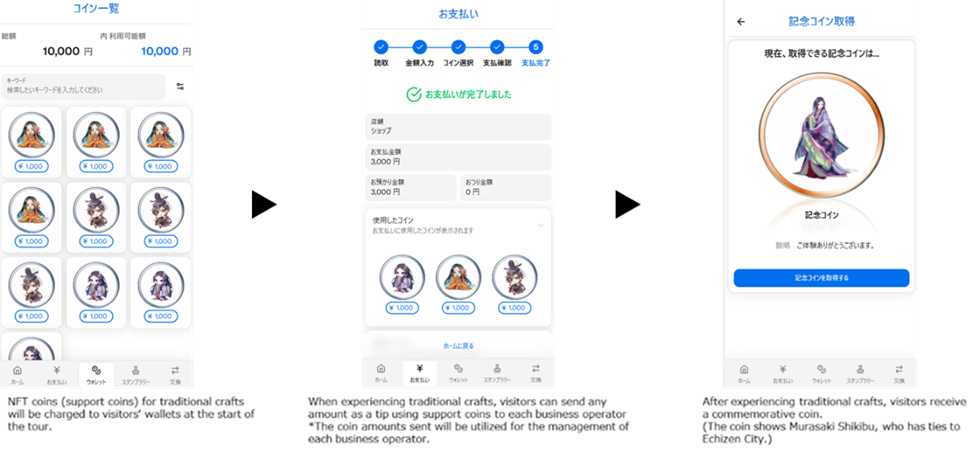 [1] Toda Corporation conducted a tourism demand and behavior survey for regional revitalization around Echizen-Takefu Station. [2] GLOCAL Sustainability Project (GSP) is a hands-on project where next-generation leaders from companies go to local communities and engage in solving social issues. Participants build ONE TEAM, deepen their experience and learning through interactions with local experts, and practice creating a sustainable society by leveraging their company's strengths to connect businesses and communities. [3] Digital currency leveraging NFT technology: Embeds images, audio, and video of various content into coins, offering them as a cashless payment "electronic currency." This technology utilizes blockchain, is collectible, and can host advertisements (Fujitsu patented).