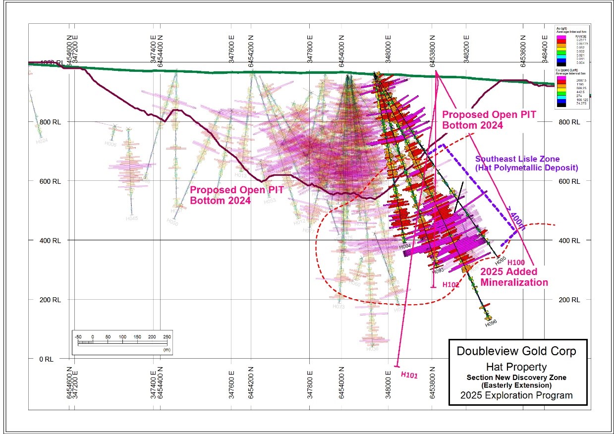 Vancouver, British Columbia--(ACN Newswire - October 23, 2025) - Doubleview Gold Corp (TSXV: DBG) (OTCQB: DBLVF) (FSE: 1D4) ("Doubleview" or the "Company") is pleased to report that ongoing drilling at its 100%-owned Hat Polymetallic Deposit in northwestern British Columbia has extended the mineralized system approximately 320 meters eastward, further confirming that the deposit remains open in multiple directions. The 2025 exploration program continues to expand the mineralized envelope, with results expected to contribute significantly to the upcoming Mineral Resource Estimate (MRE).