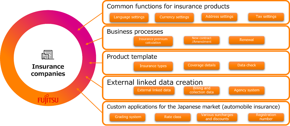 The platform is enhanced with Fujitsu's unique developments, including functions, templates, and external data linkage capabilities that address specific Japanese market processes and legal regulations. As a first step, the platform will primarily feature common functions and business processes, such as language settings, along with capabilities specifically for automobile insurance, a high-demand area for both agency-based and online insurance.