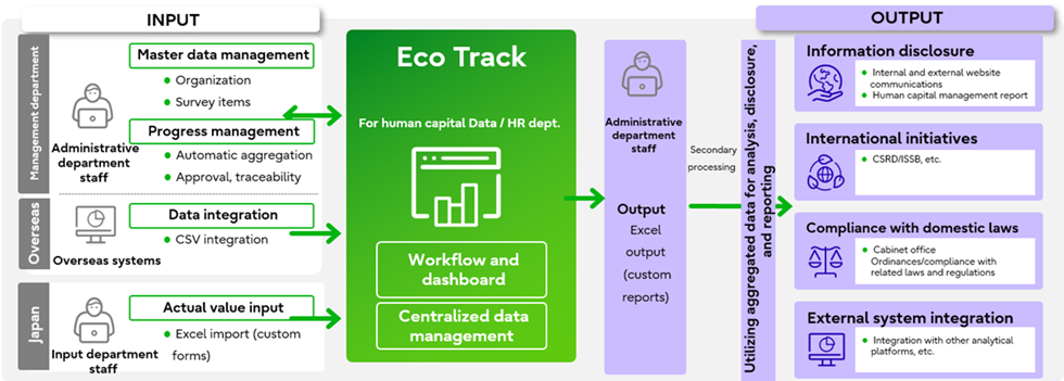 The SaaS-based service comprehensively supports the collection, aggregation, and disclosure of various data, including human capital information and other non-financial information, required for corporate sustainability management.
