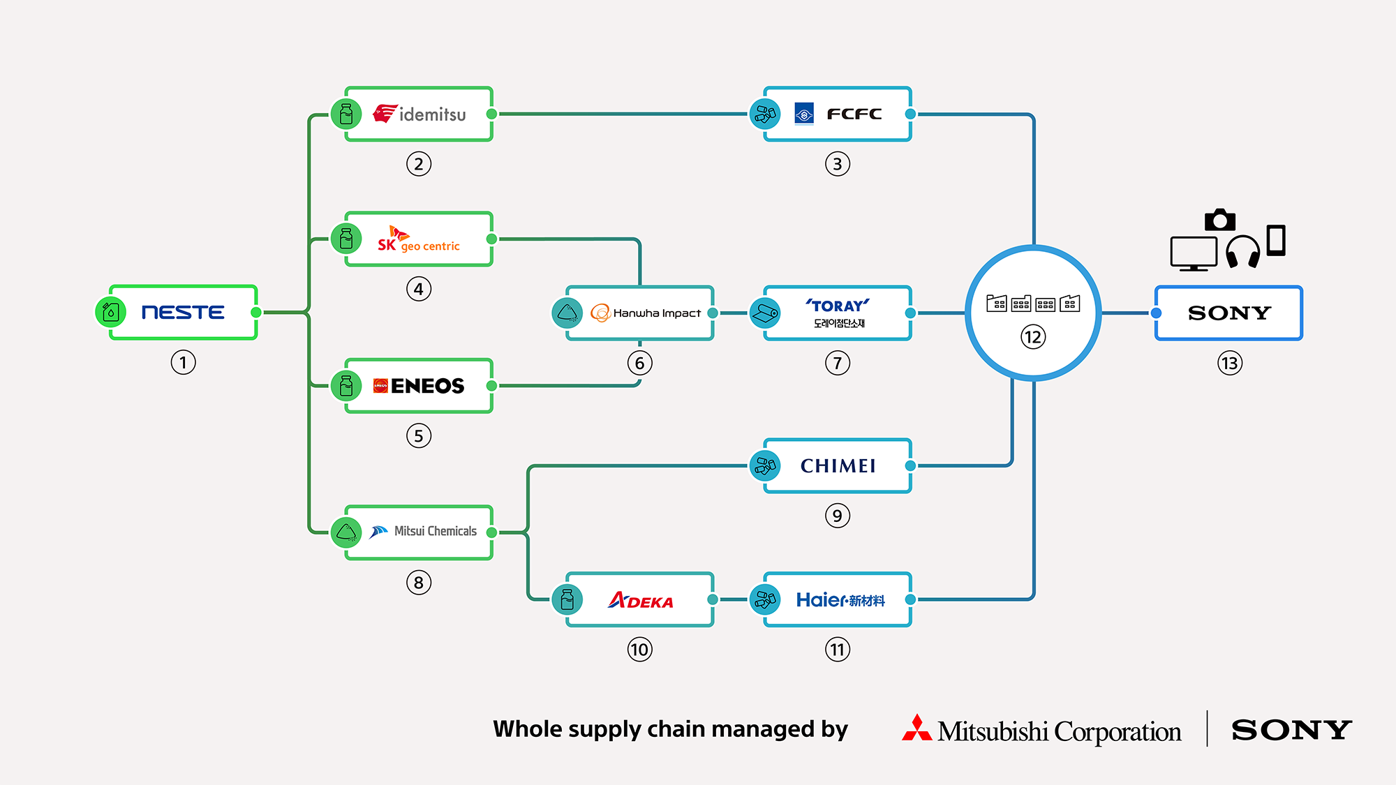 <Overview of the Entire Supply Chain> (1) Production of renewable naphtha — Neste Corporation / (2) Production of renewable styrene monomer — Idemitsu Kosan Co., Ltd. / (3) Production of renewable polystyrene resin — Formosa Chemicals & Fibre Corporation / (4) Production of renewable para-xylene — SK Geo Centric Co., Ltd. / (5) Production of renewable para-xylene — ENEOS Corporation / (6) Production of renewable terephthalic acid — Hanwha Impact Corporation / (7) Production of renewable PET resin — Toray Advanced Materials Korea Inc. / (8) Production of renewable bisphenol-A — Mitsui Chemicals, Inc. / (9) Production of renewable polycarbonate (PC) resin — CHIMEI Corporation / (10) Production of renewable flame retardants — ADEKA CORPORATION / (11) Production of renewable PC/ABS resin — Qingdao Haier New Material Development Co., Ltd./ (12) Molding manufacturers / (13) Design and manufacturing of finished products — Sony Corporation