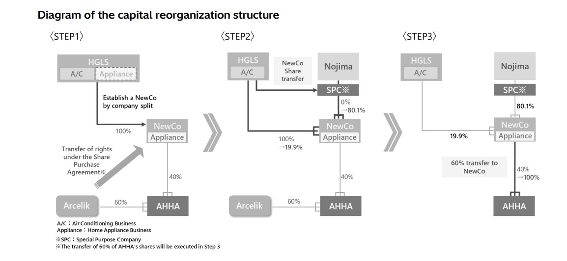In addition, with respect to Arçelik Hitachi Home Appliances B.V. (“AHHA* 1”), which was jointly established by Hitachi GLS and Arçelik A.S. (“Arçelik”) and operates the Hitachi-brand home appliance business in overseas markets, Hitachi GLS and Arçelik have entered into a share purchase agreement concerning the 60% stake in AHHA held by Arçelik. The rights and obligations (contractual position) under this share purchase agreement will be succeeded by the new company through the company split.