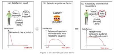 This combines satisfaction and behavioral-guidance factors, and calculates how the satisfaction level changes in response to incentives being offered. Figure 1C shows how offering of a coupon can extend the tolerable wait time of a particular user. The behavioral-guidance model identifies several high-receptivity behaviors. Then, by extracting those behaviors which contribute the most to congestion mitigation, it discovers the behaviors that people are likely to be receptive to, and that are linked to mitigating congestion. By displaying the extracted behavior options on smartphones, the system suggests optimal behaviors.