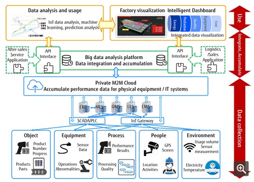 - Building IoT platforms that utilize data in the factory Using Fujitsu's unique intelligent network communications technologies, the companies have improved the slow and unstable communication in the existing large-scale network, building a low-cost system to automatically collect energy consumption data, including for electricity, water and gas. In addition, by collecting and managing data through the IoT platform, energy consumption has been reduced, supporting the realization of a green factory. - Building a big data analysis platform This system aggregates and centralizes the manufacturing progress data collected through the IoT platform, such as from sensors. This aggregated big data is processed and analyzed in real time under advanced security, enabling the detection of warning signs of problems in manufacturing equipment. - Building a system for visualizing efficiencies throughout the factory Using FUJITSU Enterprise Application Intelligent Dashboard, Fujitsu Limited's solution that supports the overall optimization of factories, with the big data analysis platform, this system displays important key performance indicators, such as manufacturing, energy consumption, quality, facilities status, and expenses, in an integrated fashion. At the same time, it monitors the status of the production lines in real time, visualizing the efficiency of the factory as a whole. - Establishing standards for evaluating the degree of maturity of the smart factory Fujitsu assisted in formulating standards and an evaluation model for the degree of maturity of INESA Group's smart factory using the three criteria of technology, implementation, and integration, based on INESA Group's definitions and goals for smart manufacturing. In addition, during this smart manufacturing model factory project with INESA Group, the companies are carrying out studies and evaluations, extracting content and technology common across the industry and standardizing it, aiming to popularize a shared INESA Group standard within the industry.
