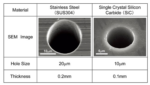 The picosecond class DUV laser has a shorter wavelength than the short pulse YAG or green lasers commonly used in micromachining products. The smaller focal spot diameter allows finer machining, improving the minimum machining diameter to 10 micrometer (micro: 10-6), compared to 50 micrometer with the conventional ABLASER (which uses a green laser). In addition to enabling extremely fine machining, the ABLASER-DUV features a near-perfect circular focus spot allowing an outstanding level of precision in hole machining.