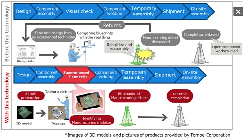 In recent years, there has been a trend in which the scale of structures has been getting larger and more complex. It is therefore expected that the visual and manual process of accurately and efficiently judging whether a manufactured product aligns with its blueprints will become more and more problematic. Fujitsu has together with Tomoe Corporation, which operates businesses from general construction to steel towers, bridges and steel frames, developed a system that fuses 3D CAD and AR technology to analyze manufacturing components, and since 2015, conducted joint verification of its utility at Tomoe's Oyama factory. During this verification, in component assembly procedures in the manufacturing process, this system was able to reduce the time required to perform diagnostics for one manufactured component to one-tenth that of previous methods, cutting processing time to just a few minutes. Now, to the core 3D superimposed diagnostic technology established in this operational trial, Fujitsu has added diagnostic preparation functionality aimed at improving task efficiency in manufacturing facilities, as well as management and usage functionality for the diagnostic results. Fujitsu is offering this product as the 3D Superimposed Product Design Diagnostic PLM solution.