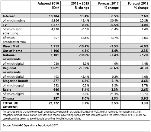 LONDON, Apr 25, 2017 - (ACN Newswire) - UK advertising expenditure grew 3.7% to reach GBP 21.4bn in 2016, the seventh consecutive year of market growth, according to the Advertising Association/WARC Expenditure Report - the UK's definitive advertising statistics.