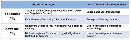 Overview - One forklift was deployed to the Yokohama City Central Wholesale Market and one to Nakamura Logistics for test runs. - A hydrogen fueling truck from the Iwatani Industrial Gases Corp. Chiba plant was used to deliver hydrogen.