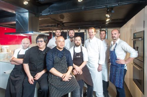 (Front Left to Right): Chef Julien Lemarie from France, Chef Alvin Leung from Hong Kong, Chef Sayan Isaksson from Sweden, Chef Filip Langhoff from Finland, Chef Richard Ekkebus from Hong Kong, Chef Mans Backlund