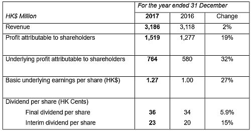 The Board of Directors recommended the payment of a final dividend of 36 Hong Kong cents per share (2016: 34 Hong Kong cents), amounted to a full-year dividend of 59 Hong Kong cents per ordinary share (2016: 54 Hong Kong cents) with an interim dividend of Hong Kong 23 cents per share (2016: 20 Hong Kong cents).