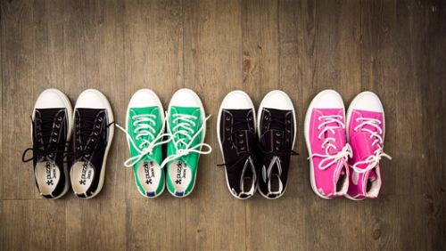 Cantopop band Super Girls members Heidi Lee and Aka Chio, Internet celebrity To Siu Kiu, and model Hilary Lau attended today's launch to lend their support. The collection, "I go to school by bus," comprises two styles of sneakers and two styles of bags. The designer aimed to re-live happy school memories through this mini collection. The sneakers are a playful twist of the classic style with L (for left) and R (for right) printed on the "wrong" shoe. The words "LUNCH BAG," are emblazoned on the tote bags, again harking back to care-free school days. The shoes come in pink and black high-tops, as well as green and black low-cut sneakers. The black and red-and-white totes allow wearers to mix and match.