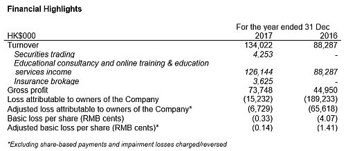 HONG KONG, Mar 30, 2018 - (Media OutReach) - China Chuanglian Education Financial Group Limited (HKEx stock code: 2371.HK, the "Group") announced its annual results. For the year ended 31 December 2017, the Group recorded a turnover from continuing operations of approximately RBM134.0 million (2016: approximately RMB88.3 million), representing a significant increase of approximately 51.8%, which is mainly due to the increased geographical coverage of the educational consultancy and online training and education business in the current year, resulting in the increase of revenue from the educational consultancy and online training and education business. During the year, the loss attributable to owners of the Company was significantly narrowed to RMB15.2 million as compared to a loss of approximately RMB189.2 million in the past year. During the year, basic loss per share was RMB 0.33 cents (2016: RMB 4.07 cents). Business Review
