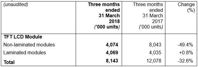 HONG KONG, Apr 24, 2018 - (Media OutReach) - China Display Optoelectronics Technology Holdings Limited ("Ch Display Opt" or the "Company", together with its subsidiaries, the "Group"; HKSE stock code: 334) is pleased to announce its unaudited financial and operating data for the three months ended 31 March 2018 (the "Period"). During the Period, due to the lack of innovative incentives that encouraged new smartphone purchases, the domestic demand of smartphones continued to drop. The Group's total sales volume of products was 8.14 million units, representing a decrease of 32.6% year-on-year, of which the sales volume of non-laminated LCD module products was 4.07 million units, a decline of 49.4% year-on-year; while that of laminated LCD module products was 4.07 million units, an increase of 0.8% year-on-year.