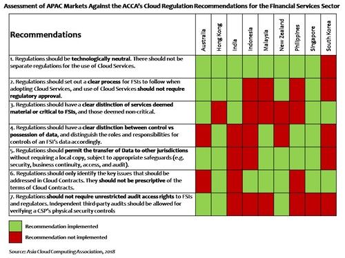 The report notes that Hong Kong, New Zealand, the Philippines, Singapore and South Korea have made positive steps in improving regulatory clarity since 2015. However, the APAC region writ large still has some way to go in breaking down the barriers to cloud adoption - data localisation requirements and excessive administrative burdens that threaten to erode essential cloud computing benefits need to be reviewed for APAC's financial services sector to truly embrace transformative use cases.