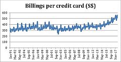 The numbers show that people in Singapore are increasingly reliant on their credit cards. Monthly billings per card hovered between S$300 to S$400 from the mid-1990s to early-2010s, but have started rising above $S400 in recent years[6]. In May 2018, monthly billings per card amounted to about S$555, after reaching S$514 in April and S$537 in March.