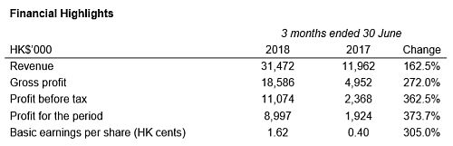HONG KONG, Aug 9, 2018 - (Media OutReach) - EFT Solutions Holdings Limited ("the Company", together with its subsidiaries, the "Group"; Stock Code: 8062) announced its first quarter result. For the three months ended 30 June 2018 ("The Reporting Period"), the Group recorded revenue of approximately HK$31.5 million which representing a significant increase of approximately 162.5% as compared with approximately HK$12.0 million in the corresponding period in 2017. During the Reporting Period, the Group recorded profit of approximately HK$9.0 million, representing a significant increase of approximately 373.7%, mainly due to the increase in the sourcing of electronic fund transfer at point-of-sale ("EFT-POS") terminals and peripheral devices and the Group's entrance into the market of point-of-sale ("POS") software solution starting from June 2018 through the acquisition of Earn World Development Limited together with its subsidiaries ("Earn World Group").