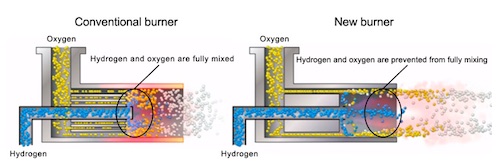 If hydrogen and oxygen are in a fully mixed state when ignited, the mixture burns violently with a high flame temperature. In the newly developed burner, hydrogen and oxygen flow side-by-side and are ignited without being fully mixed, leading to slower combustion and a lower flame temperature.