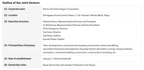Toyota City, Japan, Dec 4, 2019 - (JCN Newswire) - Panasonic Corporation and Toyota Motor Corporation announced that they have confirmed the location and executive structure of Prime Life Technologies Corporation, a new joint venture in the field of town development. The two companies concluded contracts aimed at the establishment of Prime Life Technologies on May 9, 2019, and since then they have been making preparations to establish the new company.