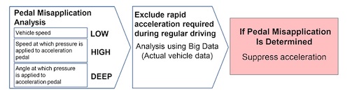 As Toyota was in the development phase, the company first looked at actual accidents where the cause was determined to be pedal misapplication, particularly analyzing situations where the accelerator pedal was pressed fully. The characteristics of these situations were then compared with big data collected from connected cars. By eliminating instances where it was determined that drivers were genuinely required to rapidly accelerate intentionally, such as when turning right or accelerating from a temporary stop, Toyota was able to identify and compute instances in which the accelerator was operated abnormally. In turn, this allowed for a function setting to control acceleration even in the absence of obstacles.