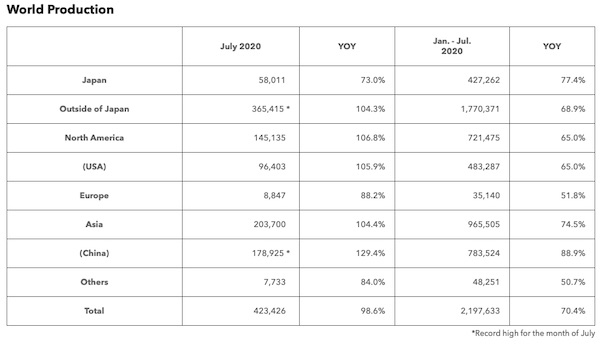 TOKYO, Aug 28, 2020 - (JCN Newswire) - Honda Motor Co., Ltd. today announced a summary of automobile production, Japan domestic sales, and export results for the month of July 2020. World Production - Production in Japan experienced a year-on-year decrease for the 11th consecutive month. - Production in regions outside of Japan experienced a year-on-year increase for the first time in ten months. - Worldwide production experienced a year-on-year decrease for the 12th consecutive month.
