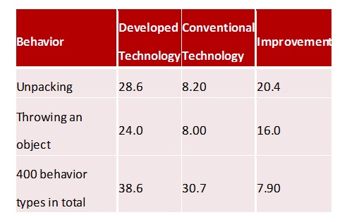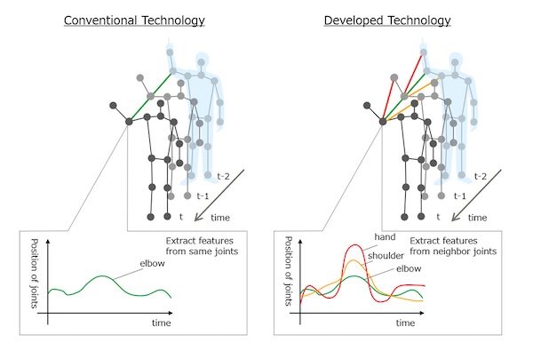 This technology was evaluated against the world standard benchmark in the field of behavior recognition using skeleton data, and in the case of simple behaviors such as standing and sitting in the open data set, the accuracy rate was maintained at the same level as that of conventional technology(4) that does not use information on neighboring joints. In the case of complex behaviors like a person unpacking a box or throwing an object, however, the accuracy rate improved greatly, to achieve an overall improvement of more than 7% over the conventional alternative to reach the world's highest recognition accuracy.