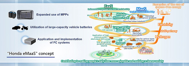 Honda is striving to realize carbon neutrality for all products and corporate activities Honda is involved in by 2050. As one of the initiatives Honda will pursue to realize this goal, Honda has developed the concept of "Honda eMaaS" through which Honda will contribute to the "freedom of mobility" and "expanded use of renewable energy" by connecting electrified mobility products and energy service. Based on this concept, Honda will expand the use of renewable energy by broadening the range of electrified products through electrification of its motorcycle and automobile products and through more utilization of MPP and also by enabling infrastructure-linked smart power operations.