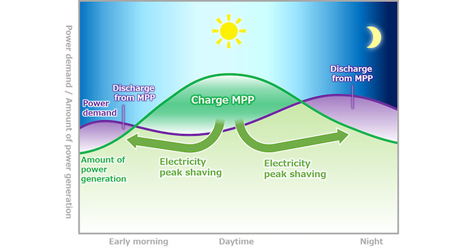 With the expanded use of MPP, it will become easier to use renewable energy which is sensitive to natural conditions. For instance, when an excess amount of electricity is generated during daytime hours through solar power generation, MPP will serve as a buffer by storing such excess electricity. Then, during late afternoon hours when electricity supply runs short of the demand, the electricity stored in the MPP during the daytime can be used to achieve peak-load shifting (or "peak shaving" that lowers and smooths out peak loads) to reduce the charging load on the power grid.