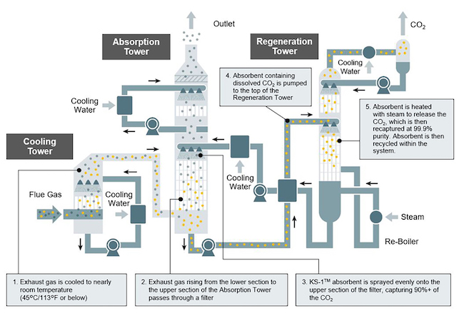 In response to that call, MHIENG developed technology enabling chemical absorption of the CO2 content of flue gas emissions. The original technology consisted of "KS-1" - a solvent whose high reliability has been confirmed by a track record of deliveries to 13 commercial plants worldwide - and the "KM CDR Process" for carbon capture. The award-winning, cost-saving "Advanced KM CDR Process" supersedes that earlier configuration and incorporates "KS-21" solvent.